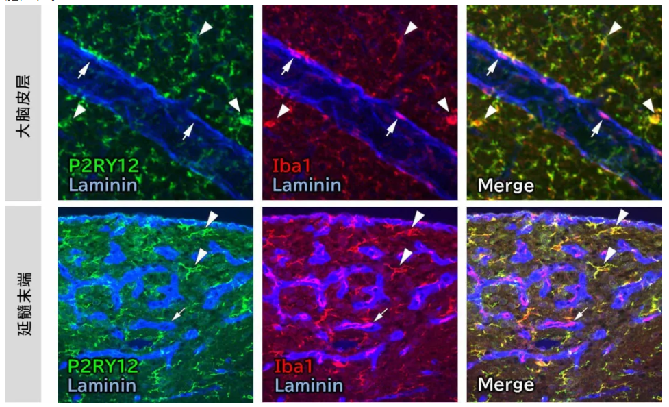P2RY12(也稱(chēng)為P2Y12)是一種腺苷5'-二磷酸(ADP)受體,也是嘌呤能G蛋白偶聯(lián)受體P2Y家族的成員。它在外周組織的血小板中表達,也在中樞神經(jīng)系統的穩態(tài)小膠質(zhì)細胞(Homeostatic Microglia)中特異性表達。由于P2RY12幾乎不在巨噬細胞中表達,所以它是用于區分存在腦血管周?chē)木奘杉毎托∧z質(zhì)細胞的有效標志物1)。此外,ADP可用作細胞損傷的信號,小膠質(zhì)細胞中的P2RY12被認為在接收神經(jīng)細胞損傷方面發(fā)揮作用。