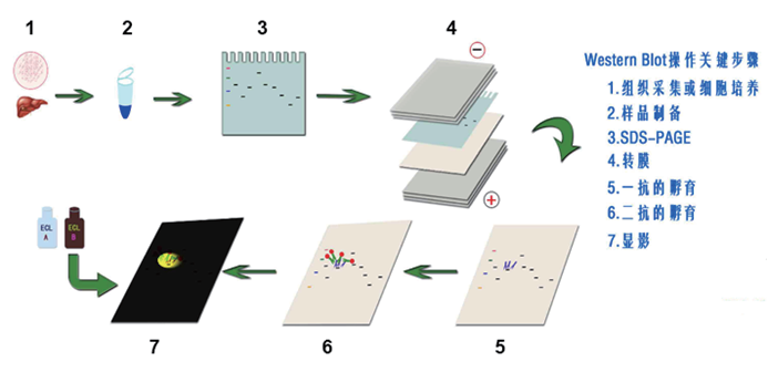免疫印跡(Immunoblotting)又稱(chēng)蛋白質(zhì)印跡(Western Blot,WB),是一種綜合性的免疫學(xué)檢測技術(shù)。它利用SDS-PAGE技術(shù)將生物樣品中的蛋白質(zhì)分子按分子量的大小在凝膠上分離開(kāi),然后用電轉移的方法將蛋白轉移到固相膜上,以固相膜上的蛋白質(zhì)作為抗原,與對應的抗體起免疫反應,再與酶標記的第二抗體起反應,經(jīng)過(guò)底物顯色或熒光成像等方法以檢測電泳分離的特異性目的基因表達的蛋白質(zhì)。WB技術(shù)現已廣泛應用于蛋白水平的表達研究、抗體活性檢測和疾病早期診斷等多個(gè)研究領(lǐng)域。